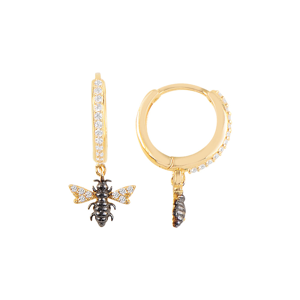 Yellow Gold Huggie Hoop and Bee Charm Earrings