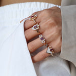 This ring is one of our most iconic SESTRA styles. This ring utilizes a blend of beautiful round and baguette-cut ruby. Shimmering white diamonds top off the design, making it glisten at every angle.