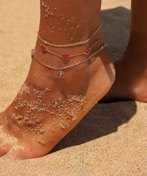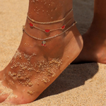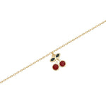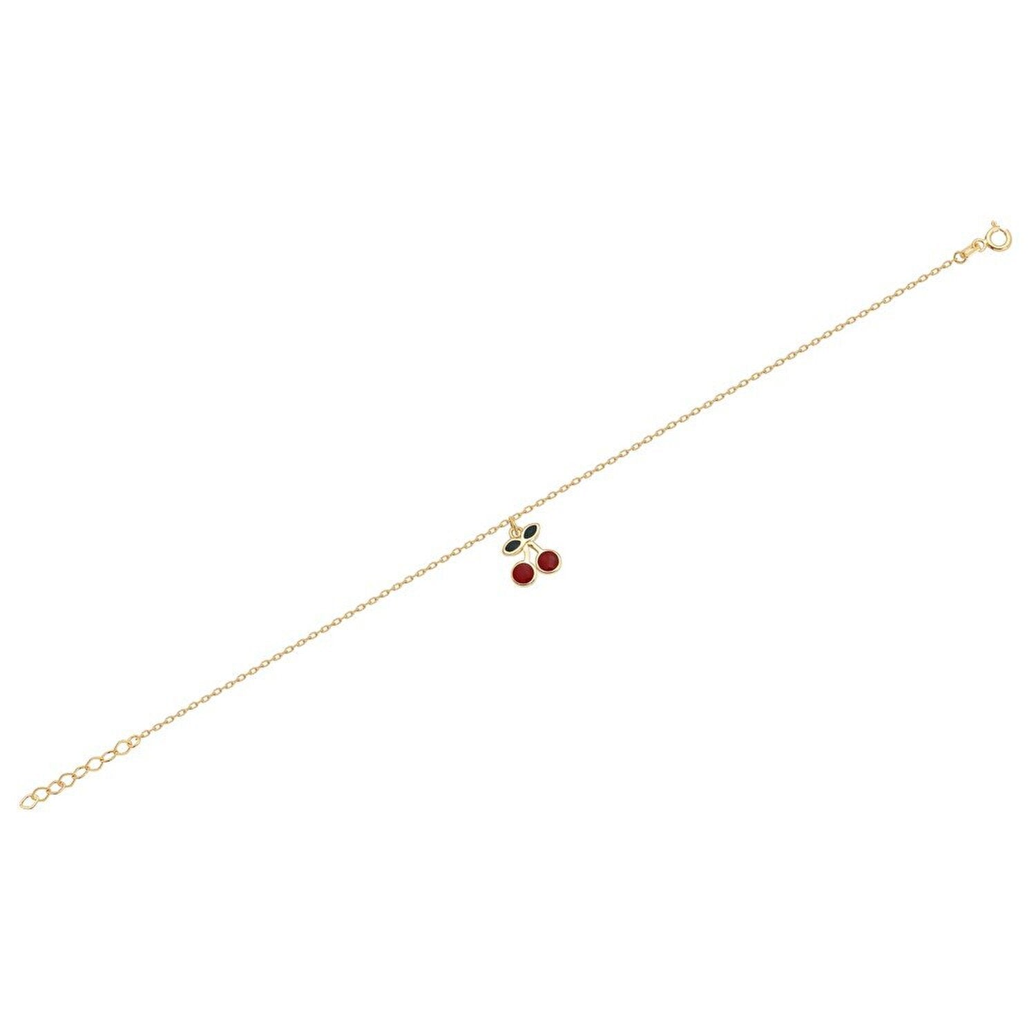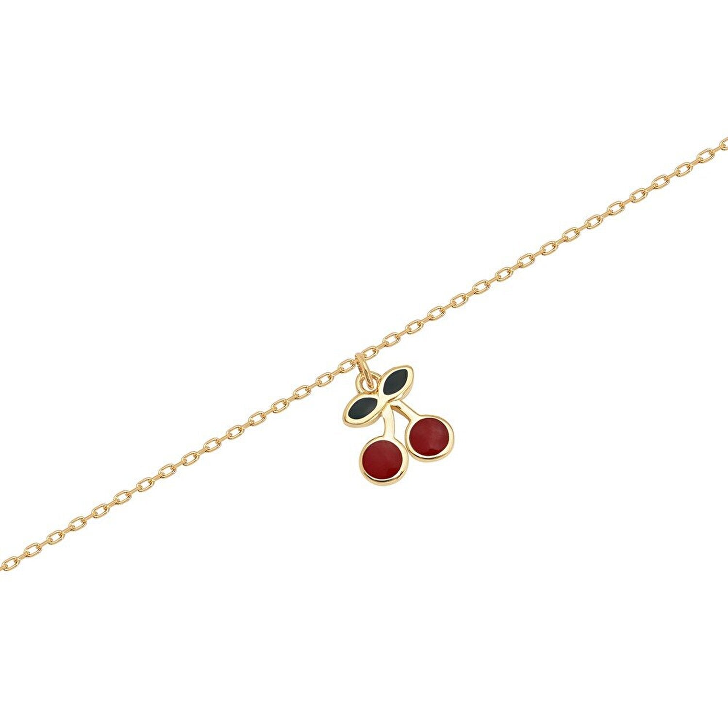 14K Yellow Gold Anklet with enamel red cherry. Fine 14k gold adjustable medium weight cable chain is approximately 10" in length with additional loops at 8" and 9".