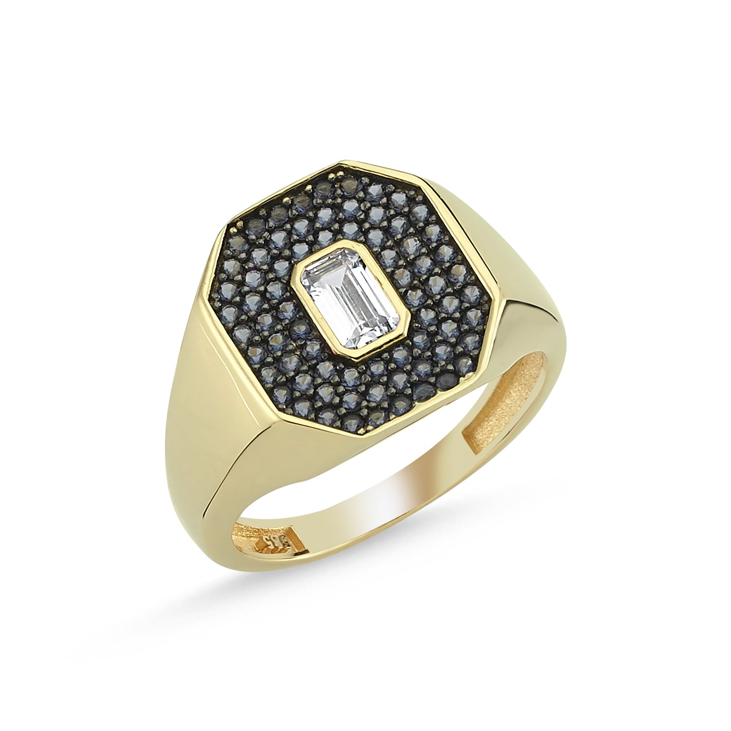 - 14K Gold pavé Blue Sapphire with Baguette Stone is a ring that will captivate you