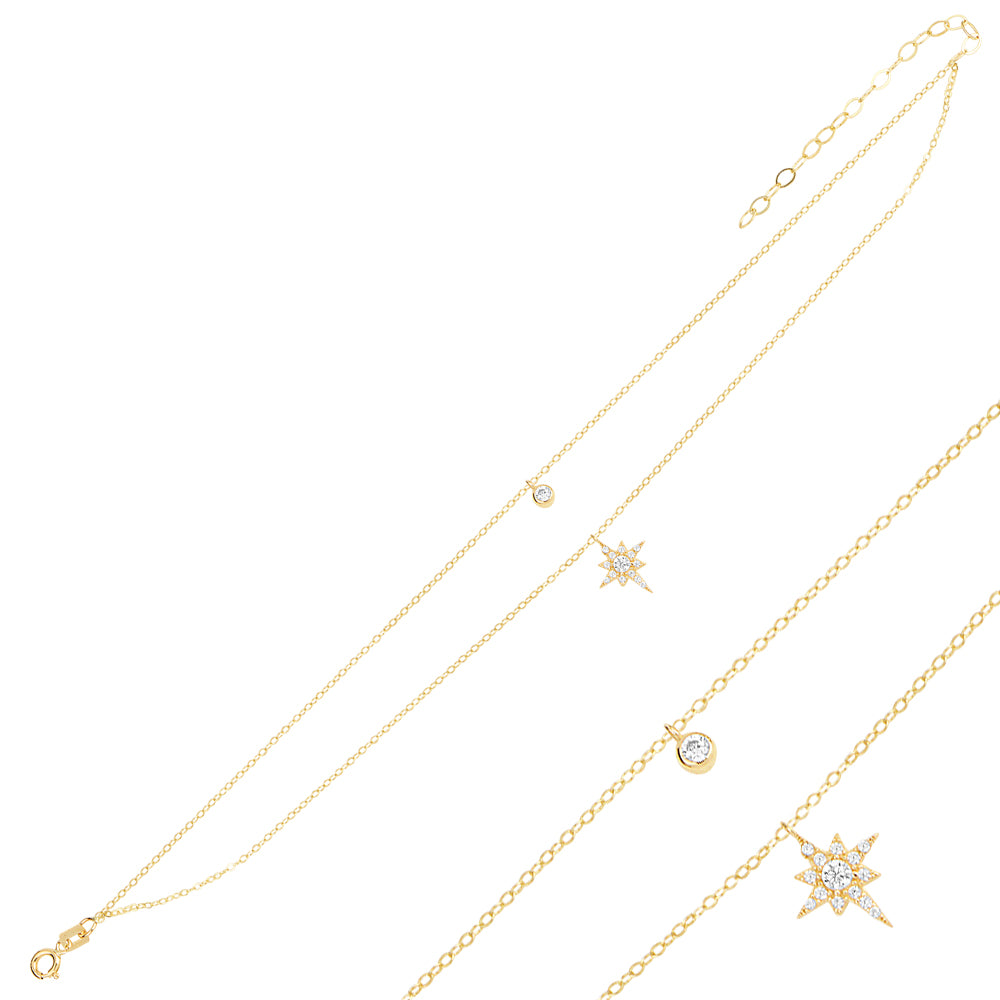 14k yellow gold double chain star anklet. Fine 14k yellow gold adjustable medium weight cable chain is approximately 10" in length with additional loops at 8" and 9".