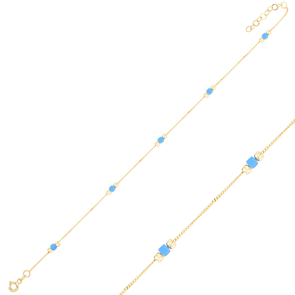 14k yellow gold and turquoise anklet features diamond-shaped turquoise stones. Fine 14k gold adjustable cable chain is approximately 10" in length with additional loops at 8" and 9".