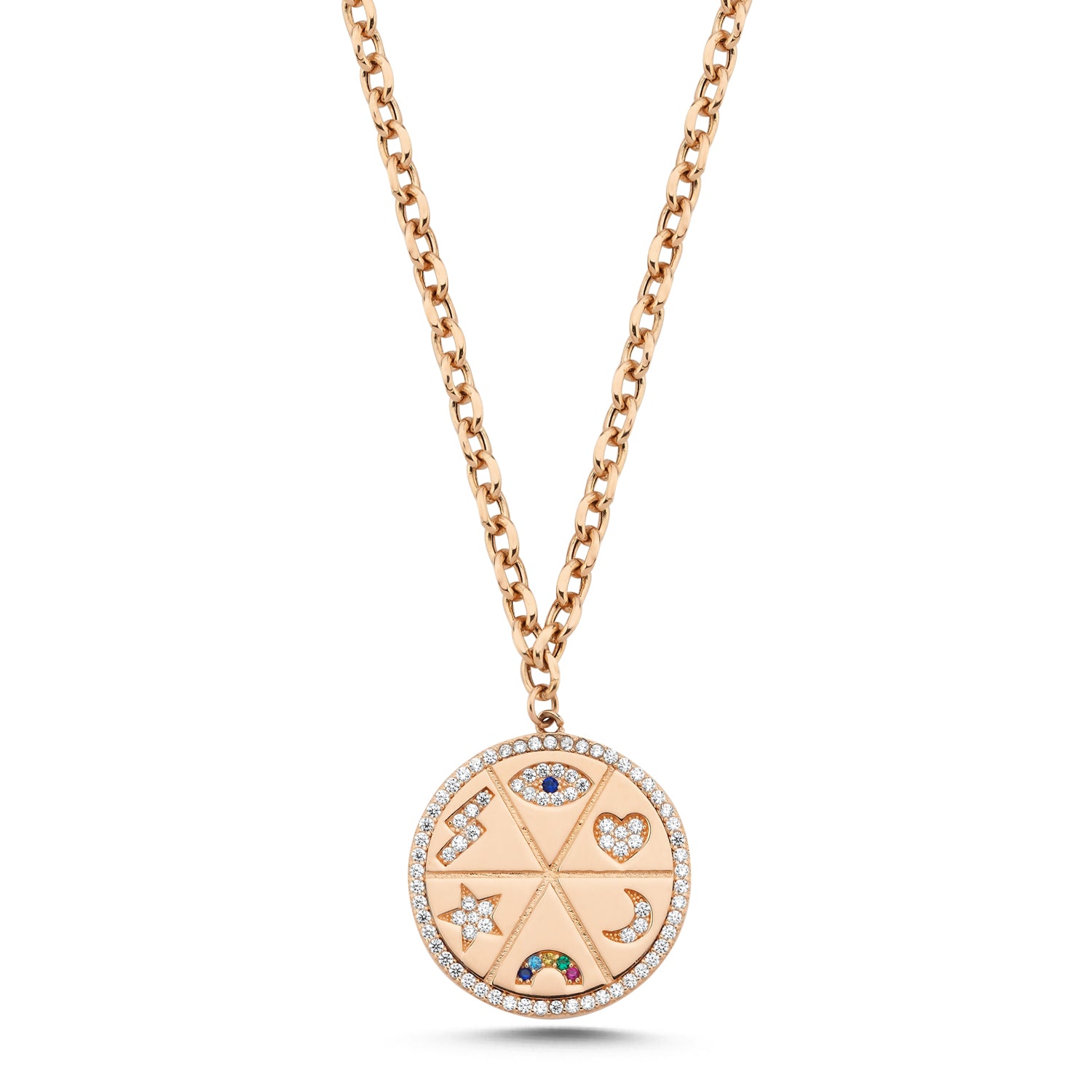 This pure gold necklace features a heart, a star sign, an evil eye, a moon, a rainbow.