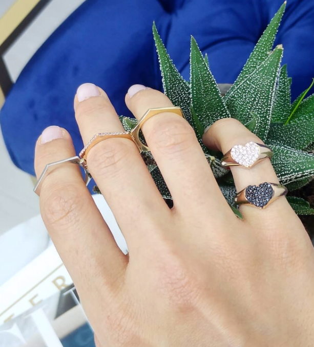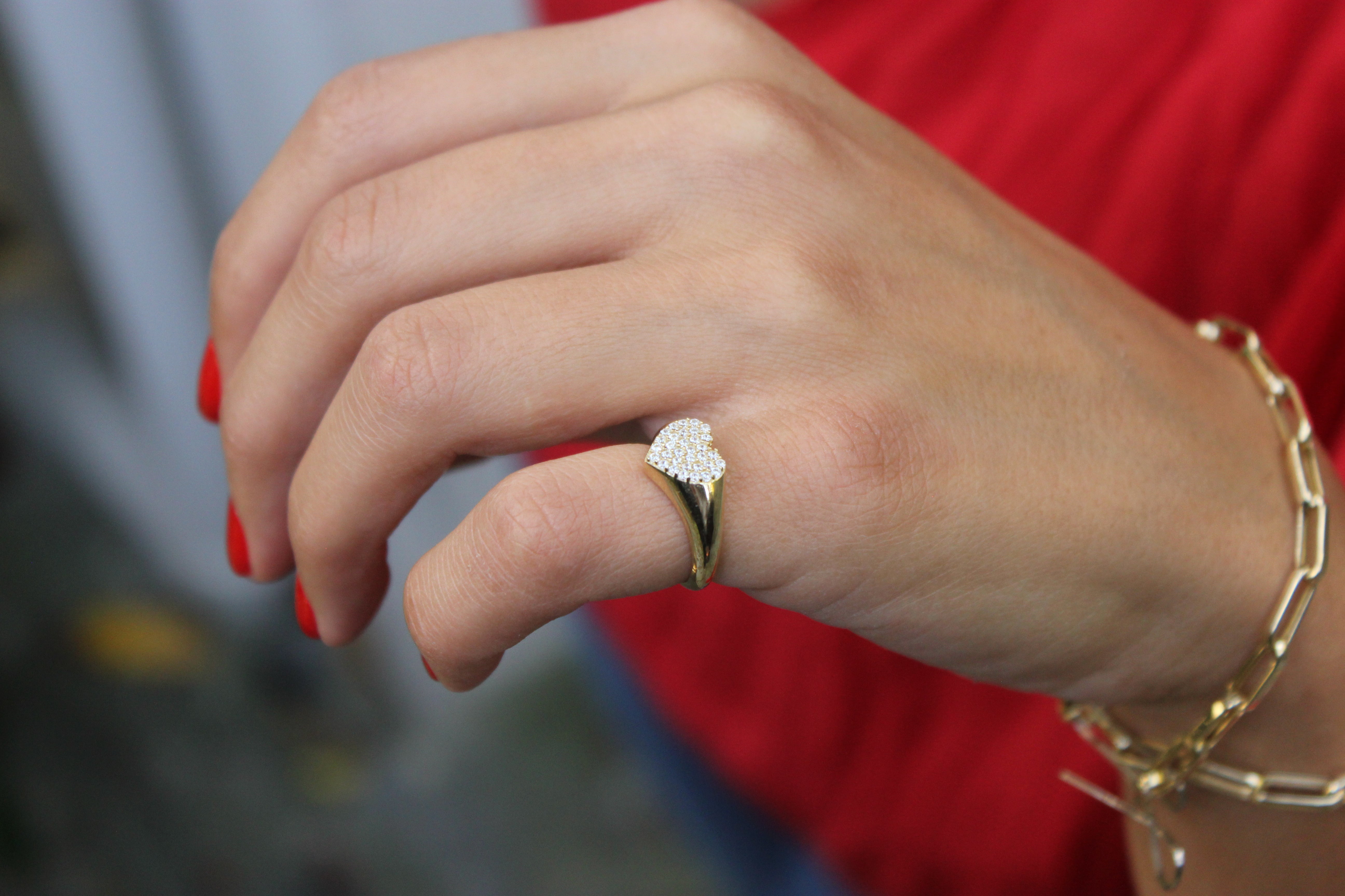 This dainty ring from SESTRA shimmers with round-cut diamonds that are pavé-set into the heart-shaped front. The design is 14-karat yellow gold.