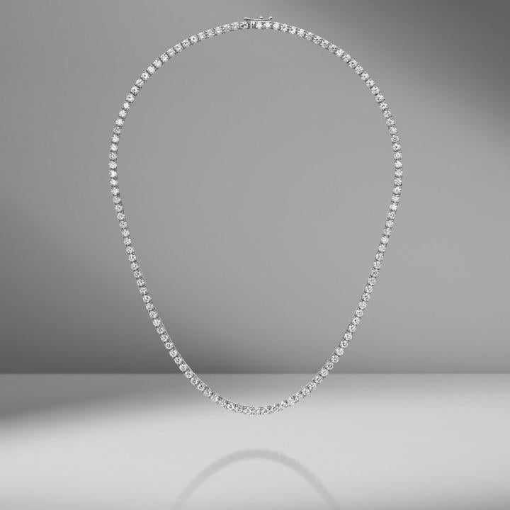Our signature 3mm- 4 prong diamond tennis necklace is rendered in a delicate handmade 14K mounting, perfect to be worn on its own or layered up.